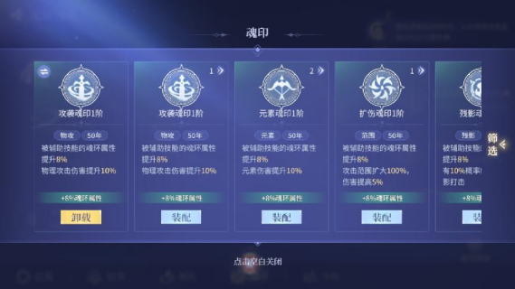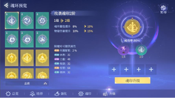 1)在魂印升级页签中,玩家可以点击魂印升级消耗相同魂印和对应的升级材料,提升魂印的等级
